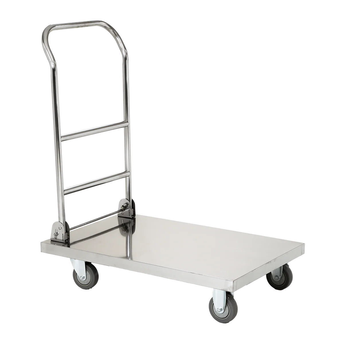 CARRO PLATAFORMA DE ACERO INOXIDABLE MARCA MIGSA. PLATAFORMA EN ACERO INOXIDABLE, MANERAL REFORZADO ABATIBLE DE ACERO INOXIDABLE DE 1” DE DIÁMETRO, MONTA SOBRE 4 RUEDAS AHULADAS DE 3” DE DIÁMETRO (2 CON FRENO).
