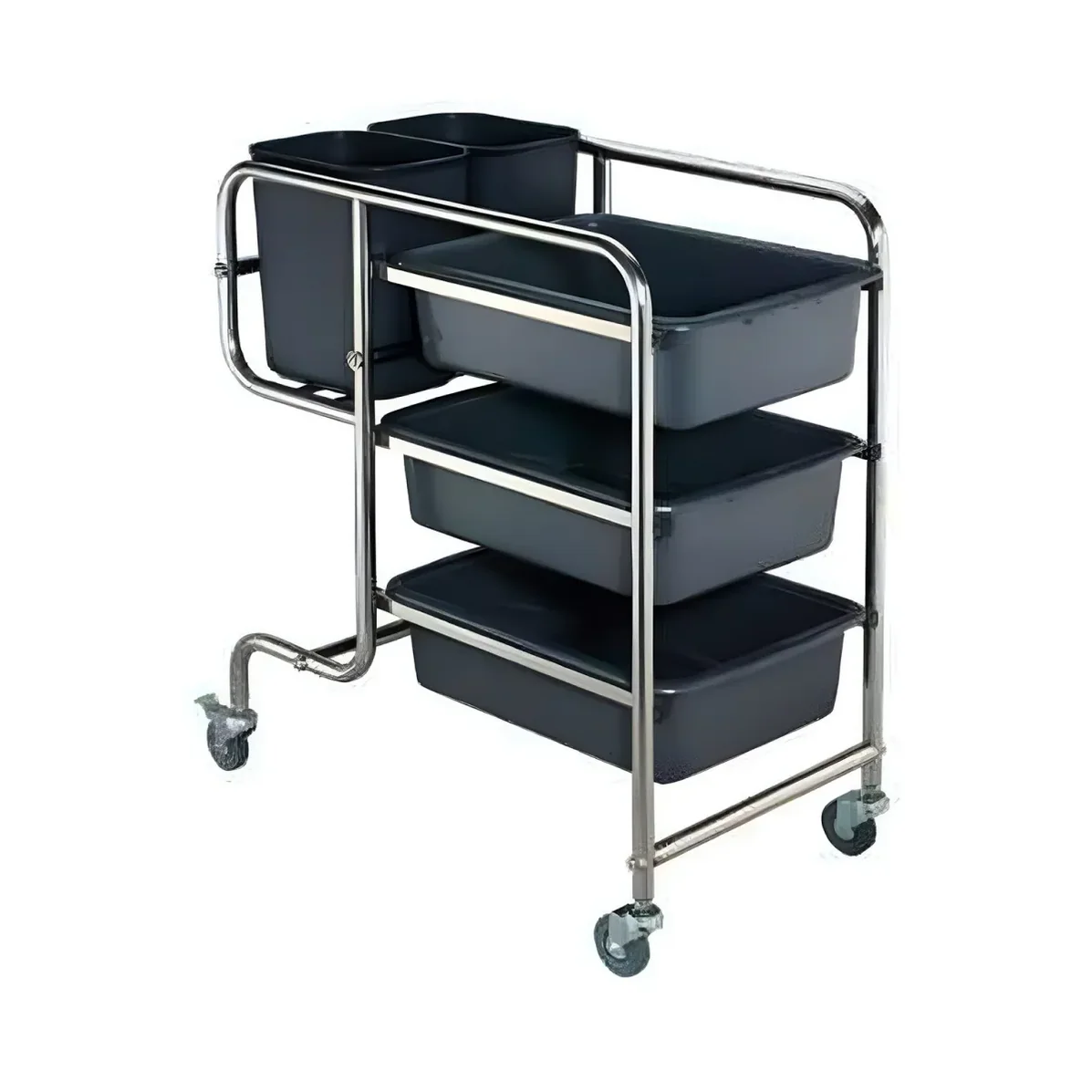 CARRO RECOLECTOR DE LOZA SUCIA CON 4 CHAROLAS MARCA MIGSA. TUBULAR DE ACERO INOXIDABLE TIPO 201, DE 3 NIVELES Y UN EXTRA, MONTA SOBRE RUEDAS, INCLUYE 4 DEPÓSITOS DE POLICARBONATO COLOR NEGRO.