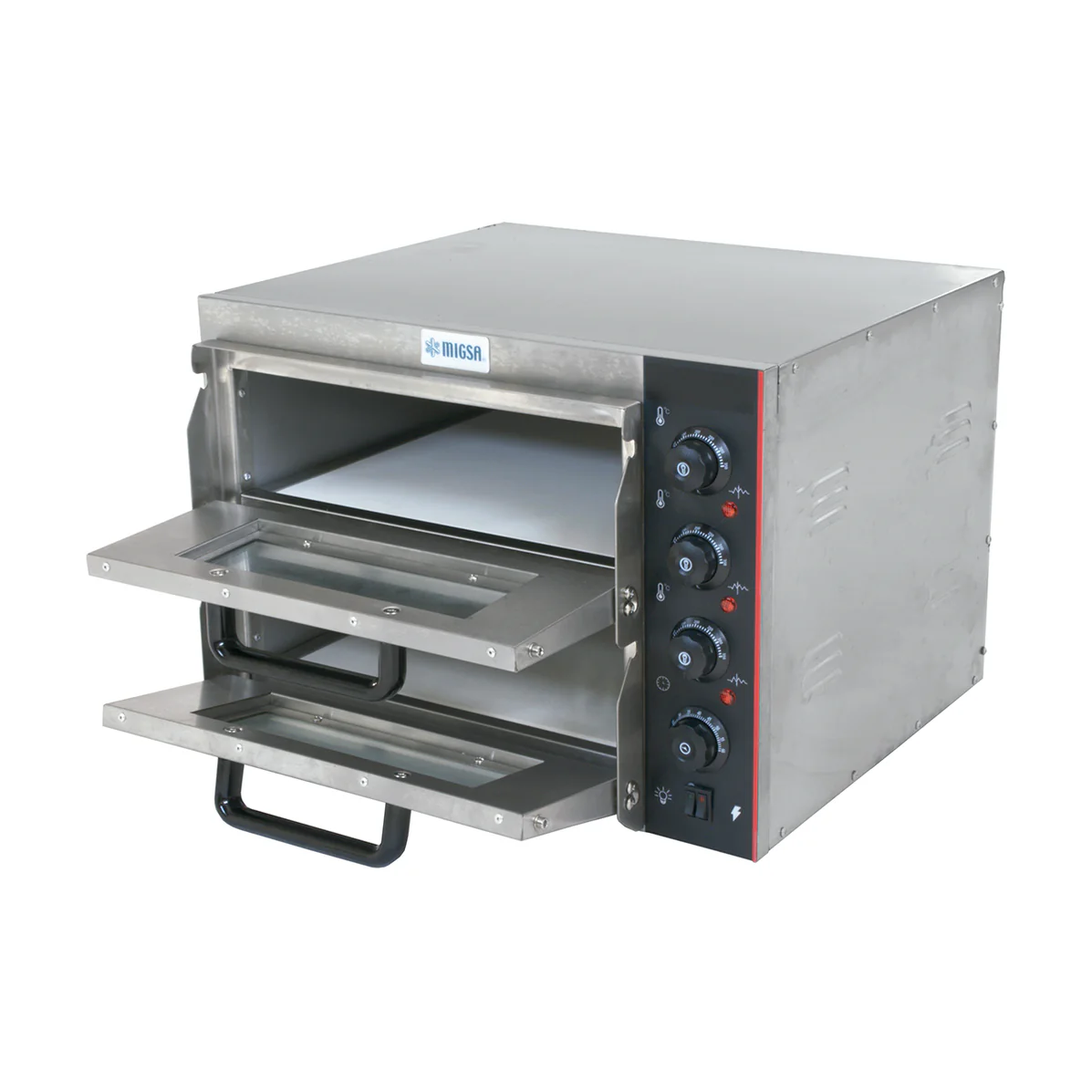 HORNO ELECTRICO PARA PIZZAS MARCA MIGSA FABRICADA EN ACERO INOXIDABLE, CON 2 COMPARTIMIENTOS INDEPENDIENTES. CONTROLES DE TEMPERATURA SUPERIORES E INFERIORES EN CADA COMPARTIMIENTO DE 50 A 300°C. PISOS REFRACTARIOS. POTENCIA DE 3 KW A 220 V / 60 HZ. PESO NETO DE 30 KG.