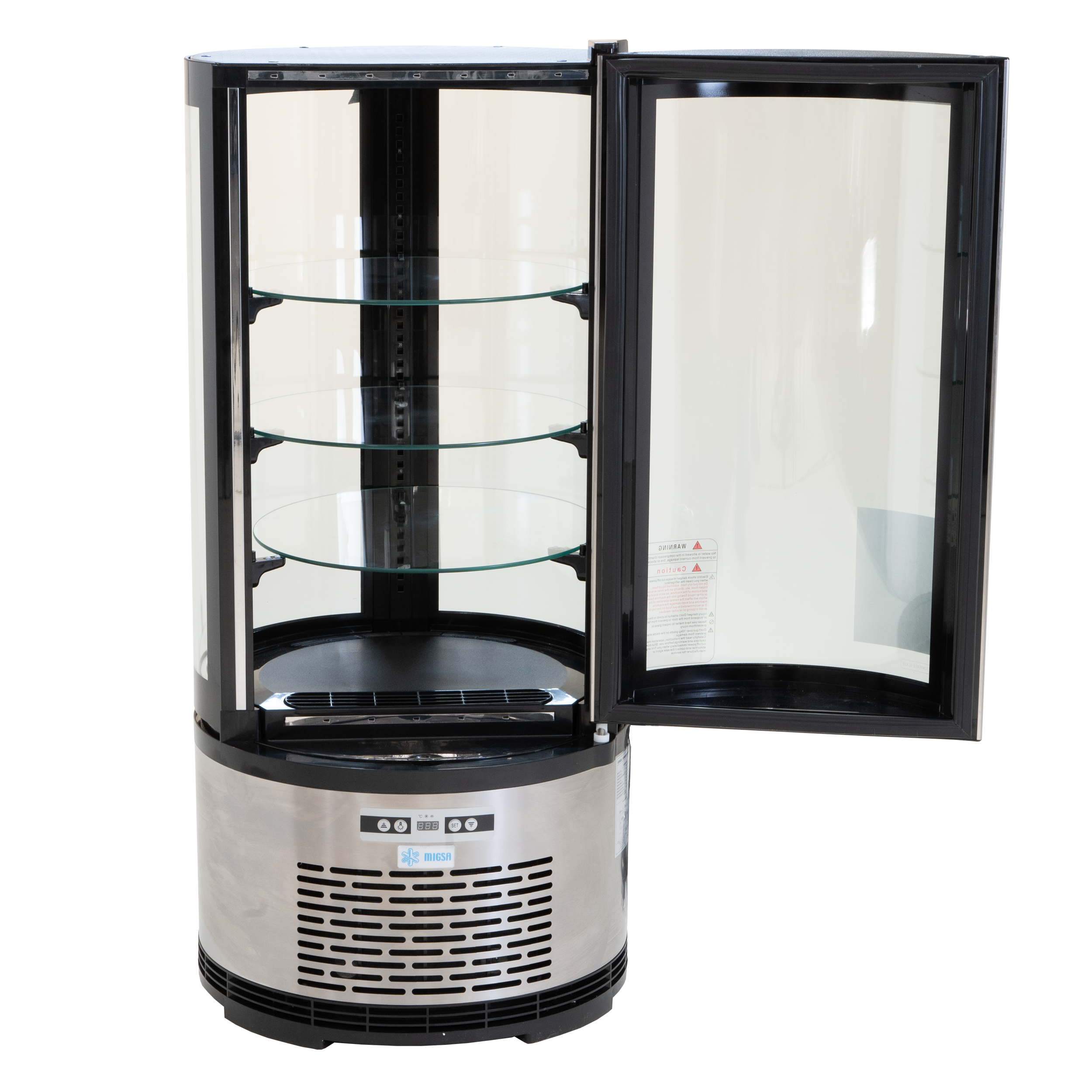 REFRIGERADOR VERTICAL CIRCULAR BASE EN ACERO INOX. MARCA MIGSA CON CAPACIDAD DE 100 L. BASE EN ACERO INOXIDABLE DE FORMA CIRCULAR CON PUERTA ABATIBLE CON AUTO CIERRE. CONTROL DE TEMPERATURA DIGITAL, RANGO DE TEMPERATURA DE 2 A 8°C Y DESHIELO AUTOMÁTICO. 3 ENTREPAÑOS DE CRISTAL CIRCULARES DE ALTURA AJUSTABLE DE GIRO MANUAL. ILUMINACIÓN LED. CORRIENTE 110 V / 60 HZ.
