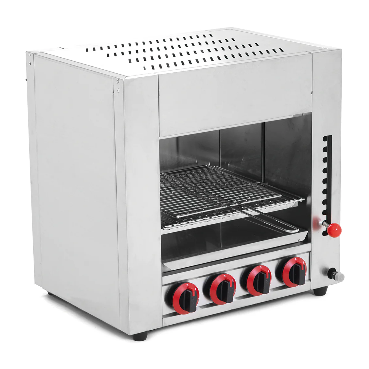 SALAMANDRA A GAS CON GATILLO DE 10 POSICIONES MARCA MIGSA. CUERPO INTERIOR Y EXTERIOR EN ACERO INOXIDABLE. 4 QUEMADORES PARA CONTROL DE TEMPERATURA REGULABLES. GATILLO DE 10 POSICIONES. PESO NETO DE 31.6 KG.