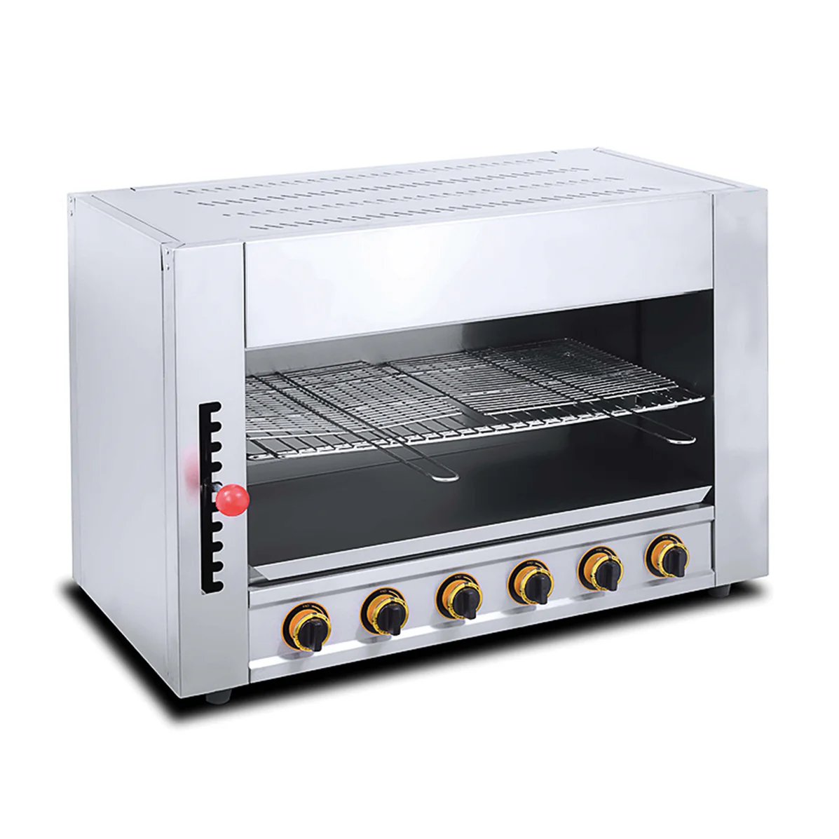 SALAMANDRA A GAS CON GATILLO DE 10 POSICIONES MARCA MIGSA. CUERPO INTERIOR Y EXTERIOR EN ACERO INOXIDABLE. 6 QUEMADORES PARA CONTROL DE TEMPERATURA REGULABLES. GATILLO DE 10 POSICIONES. PESO NETO DE 47.2 KG.